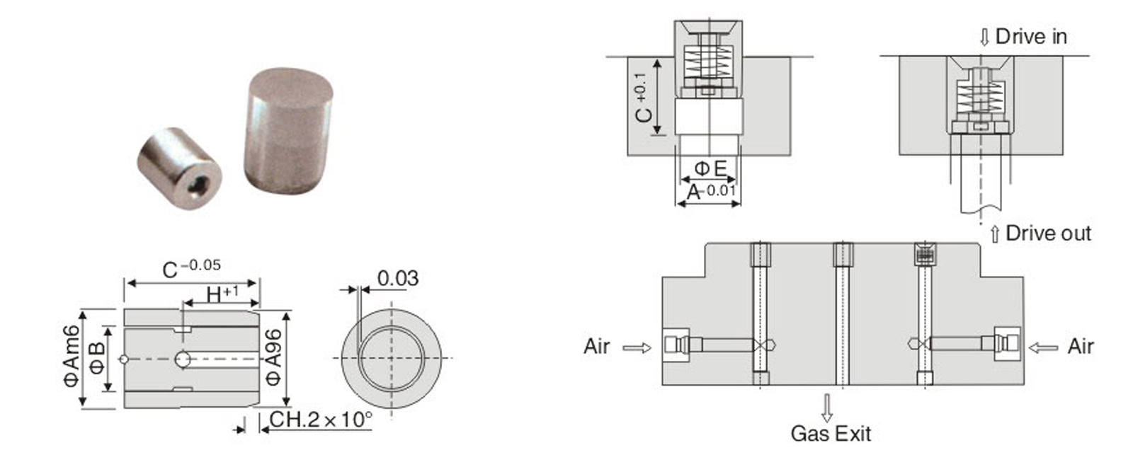 設(shè)計(jì)應(yīng)用在熱塑性模具方面, 通過(guò)透氣鋼來(lái)保證正確功能的使用 。 工作氣壓 / air pressure:1.5~6BARS