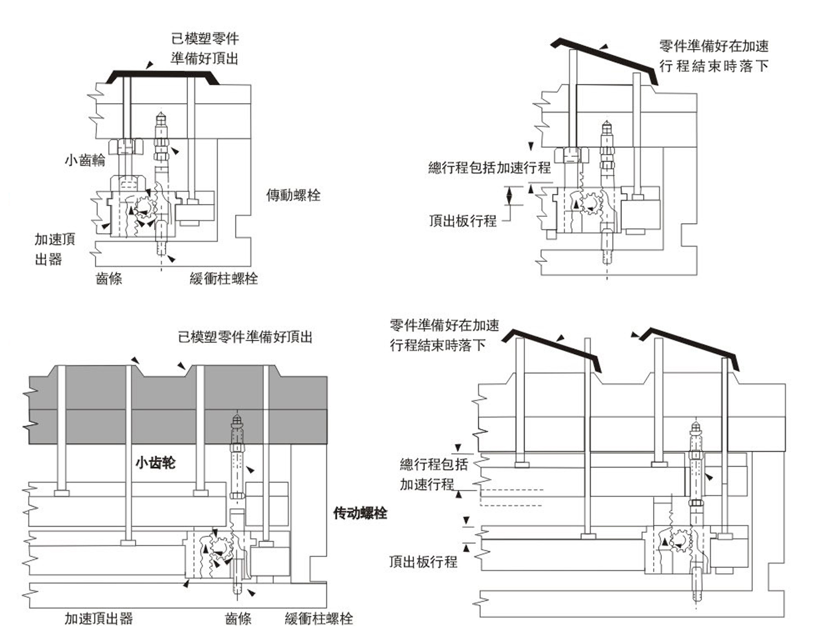 加速頂出器使用一個(gè)齒條一小齒輪結(jié)構(gòu), 以提供多達(dá)5/8英寸的額外頂針行程。它們簡單的直綫移動(dòng)可以用來增加頂針、頂針?biāo)就不蛘麄€(gè)頂出器組件的速度和行程。 這些裝置上的法蘭和圓角, 使之安裝在頂出器組件裏非常容易 。 穿過齒條部分的長方形可以防止其旋轉(zhuǎn)。 每個(gè)裝置還包括有一個(gè)緩沖柱螺栓。 該螺栓保證齒條在頂出器組件完全返回時(shí)也能肯定地返回。