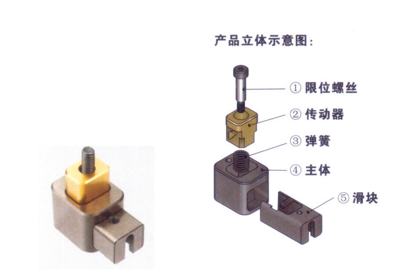 2.主體、滑塊、傳動器、限位螺絲、彈簧為一套組件,無需加工斜導柱孔及 一些繁鎖加工,因此可以降低加工成本及加工時間。