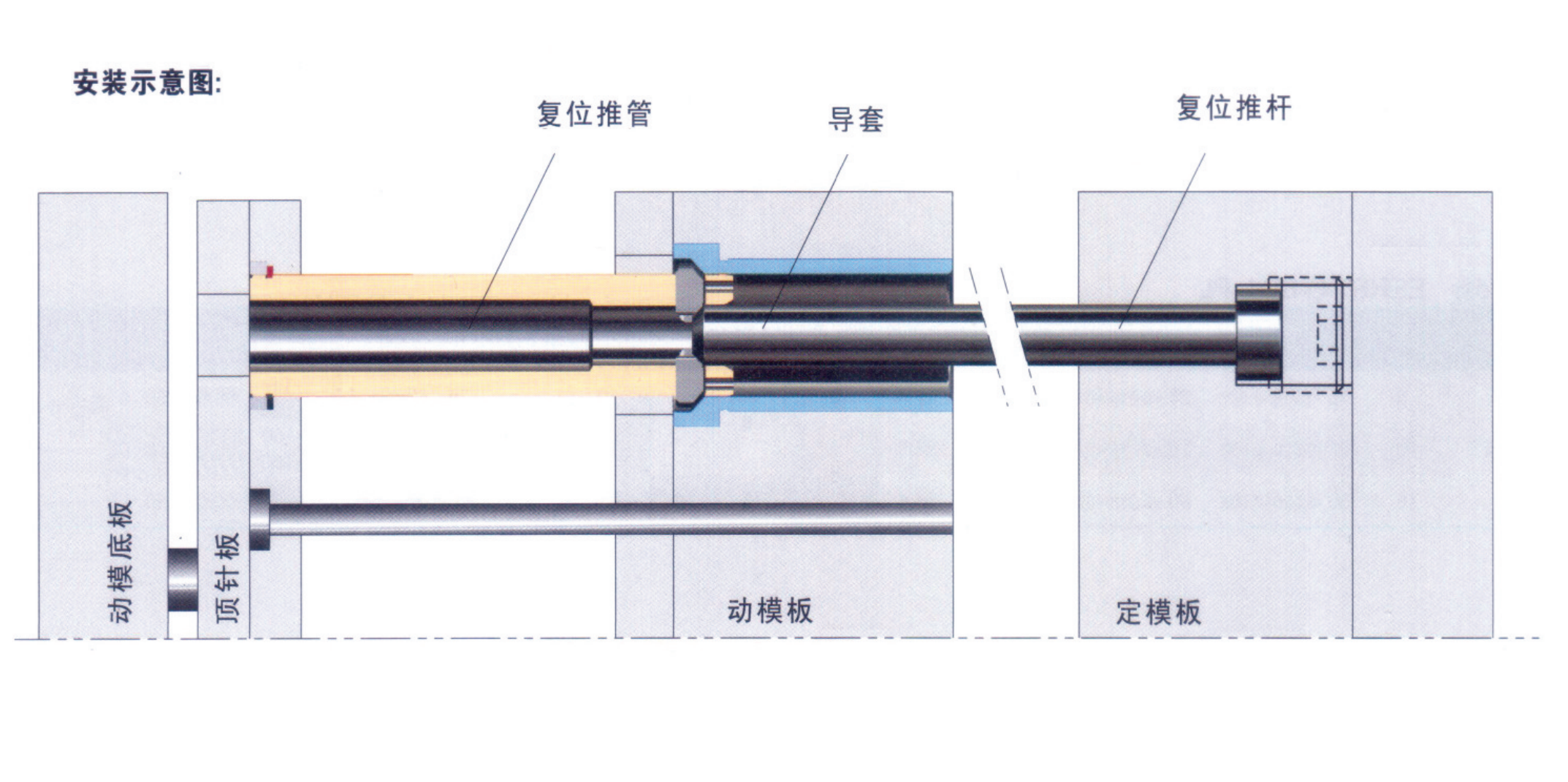 • 將復位推管安裝到頂針板上,導套安裝到動模板上,復位推桿固定在定模板上