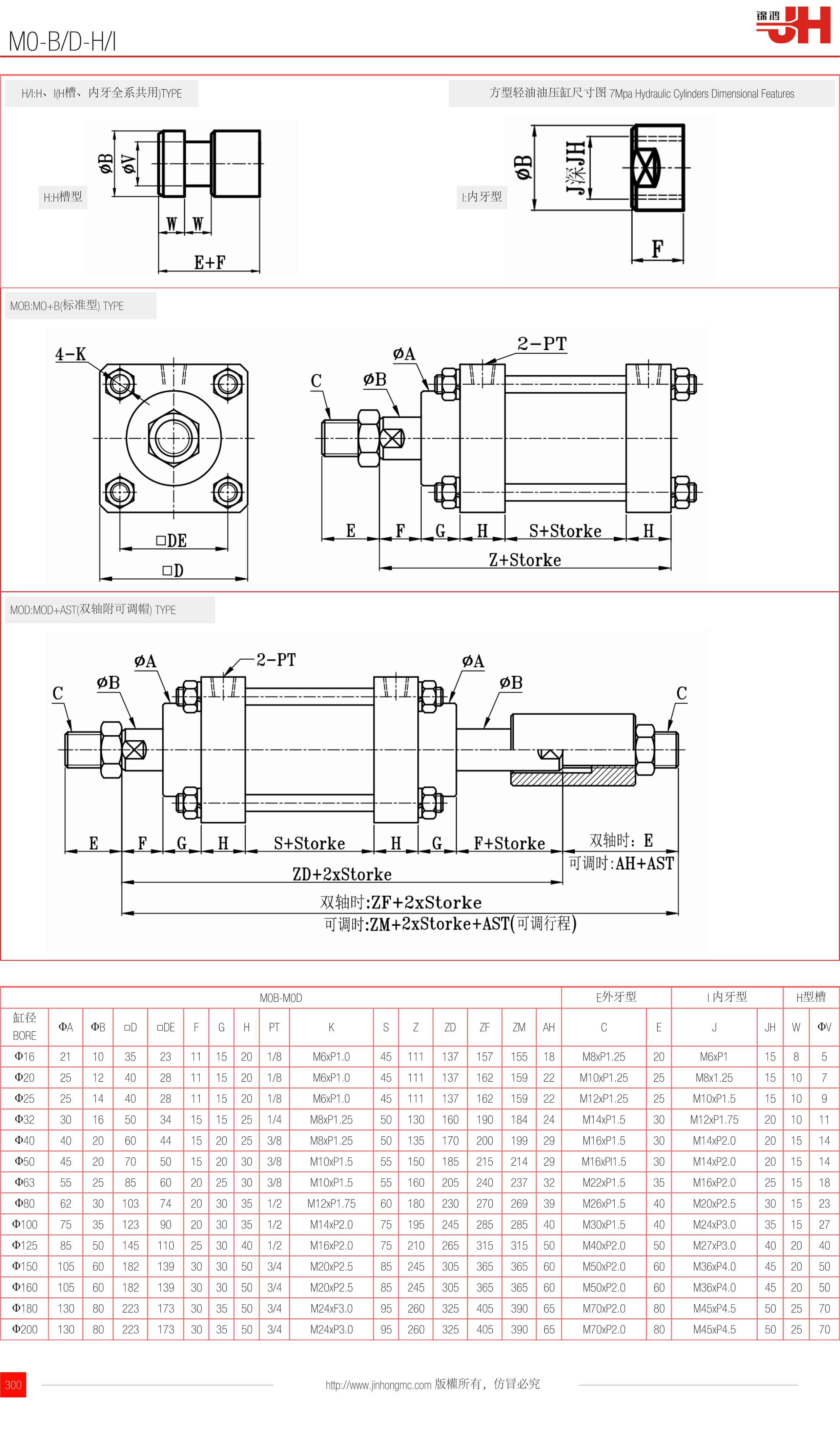 方型輕油油壓缸尺寸圖 7Mpa Hydraulic Cylinders Dimensional Features