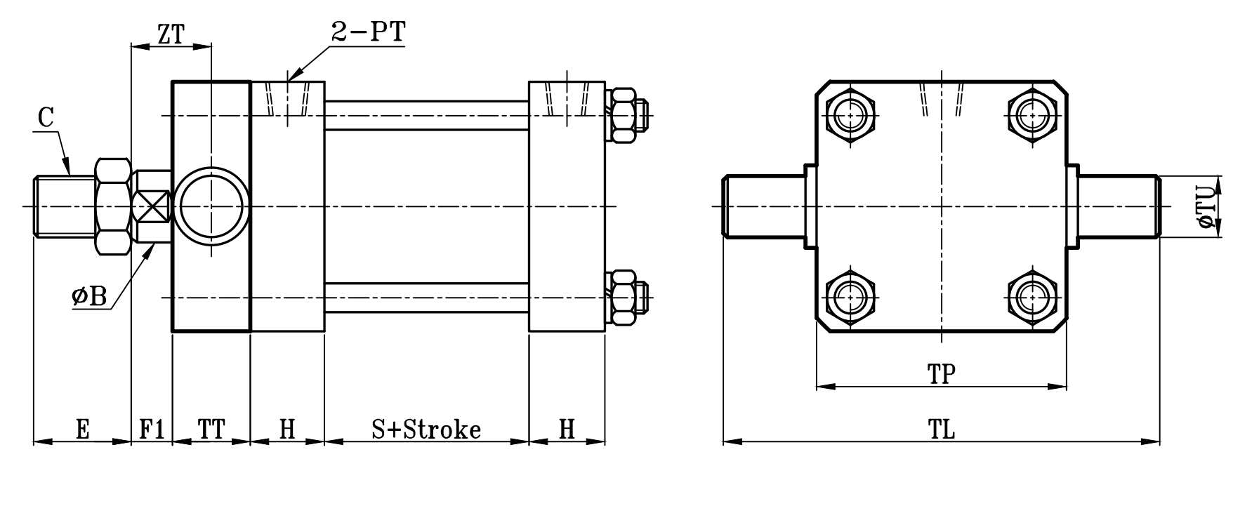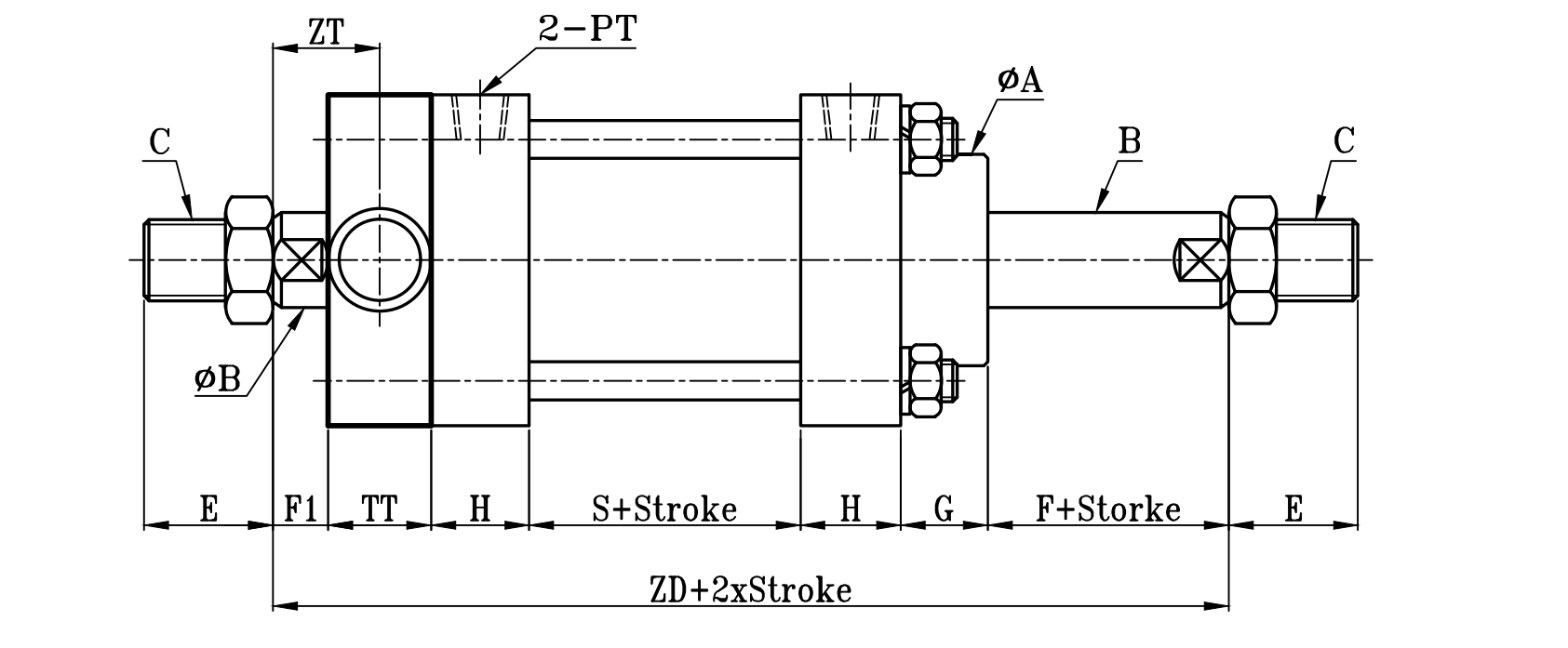 | 缸徑 BORE | ΦA(chǔ) | ΦB | C | E | F | F1 | G | H | PT | S | ZT | ZD | TL | TP | TT | ΦTU |