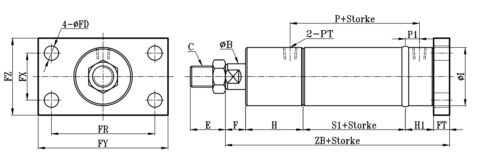 | 缸徑 BORE | ΦB | C | E | F | HI | H | ΦI | P | P1 | PT | S1 | S | ZB | ZD | FT | ΦFD | FR | FX | FY | FZ | Q | ΦR | Φ0 | ΦP |