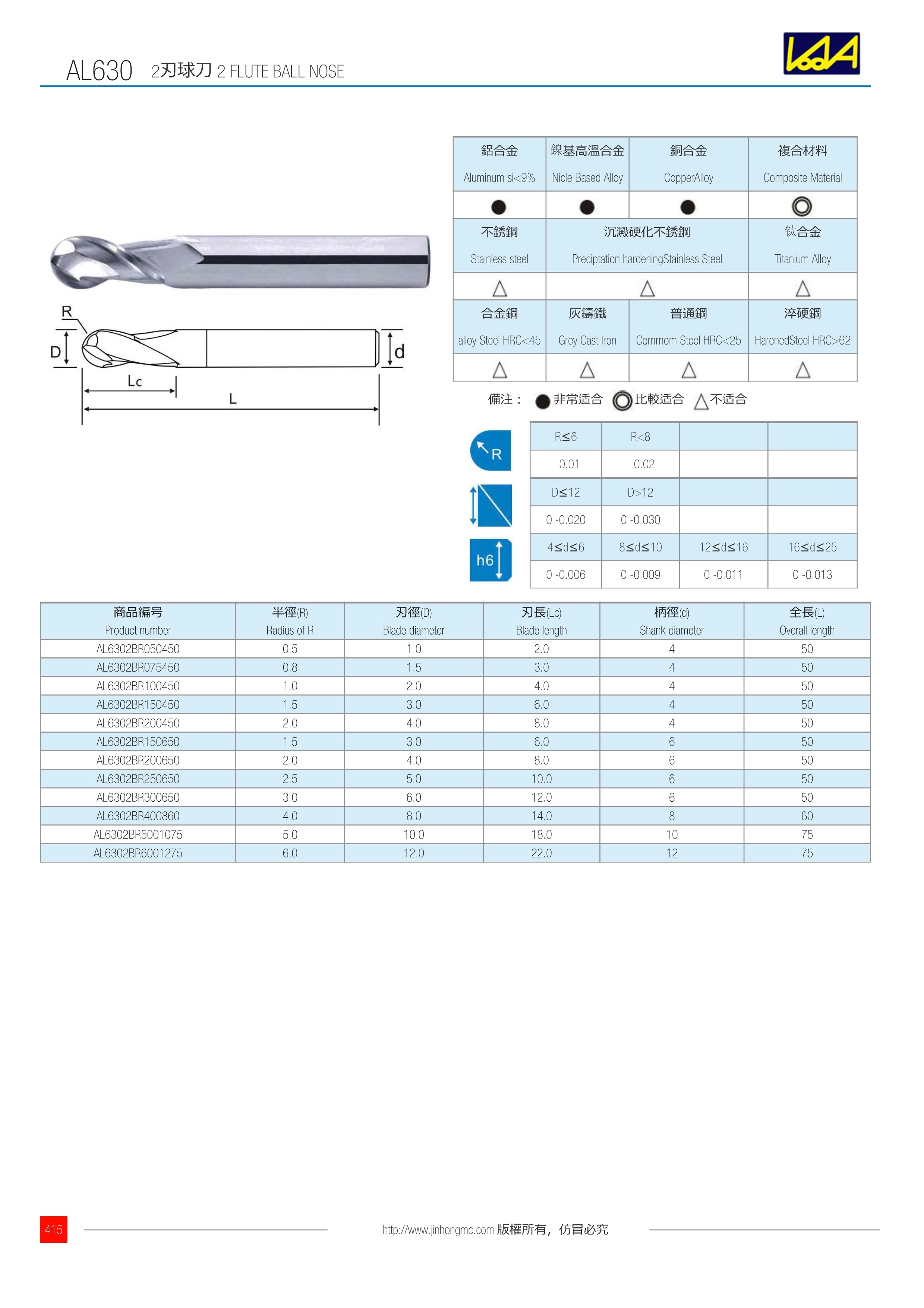 | 商品編號 Product number | 半徑(R) Radius of R | 刃徑(D) Blade diameter | 刃長(Lc) Blade length | 柄徑(d) Shank diameter | 全長(L) Overall length |