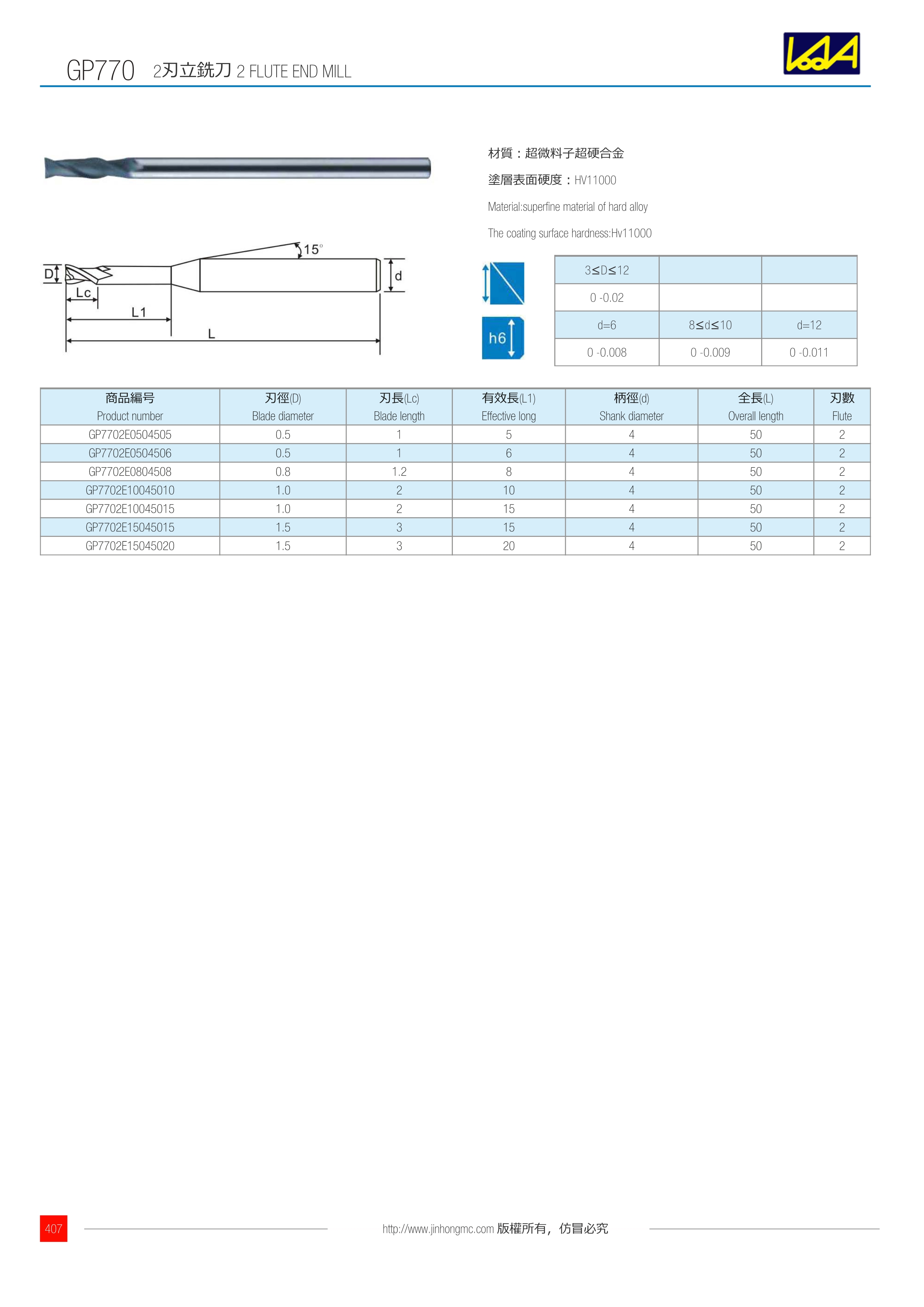 | 商品編號(hào) Product number | 刃徑(D) Blade diameter | 刃長(zhǎng)(Lc) Blade length | 有效長(zhǎng)(L1) Effective long | 柄徑(d) Shank diameter | 全長(zhǎng)(L) Overall length | 刃數(shù) Flute |